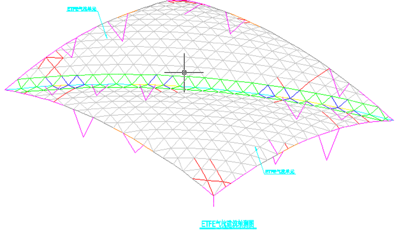 本工程包含730(如圖10:下部364個,上部366個)個ETFE氣枕,每個三角形區(qū)域有一個氣枕。氣枕總面積約8000㎡,其中最大的約12.08㎡,最小的約1.64㎡。本工程全部氣枕采用雙層ETFE。經(jīng)驗算,雙層氣枕可以滿足本項目的各種荷載組合。