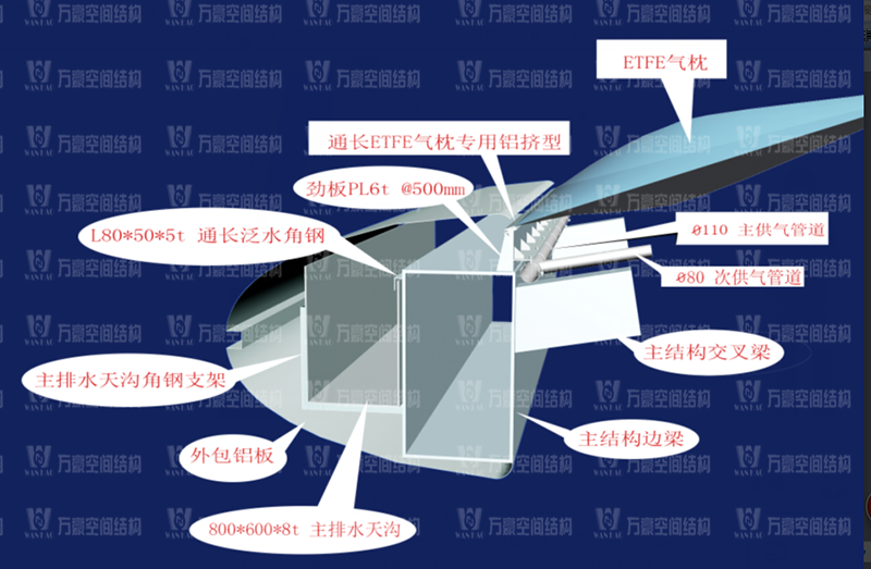 本工程主體結(jié)構(gòu)用鋼量約1100噸,鑄鋼節(jié)點160噸;膜二次鋼結(jié)構(gòu)用鋼量約190噸,氣枕膜總用量面積約8000平方米。